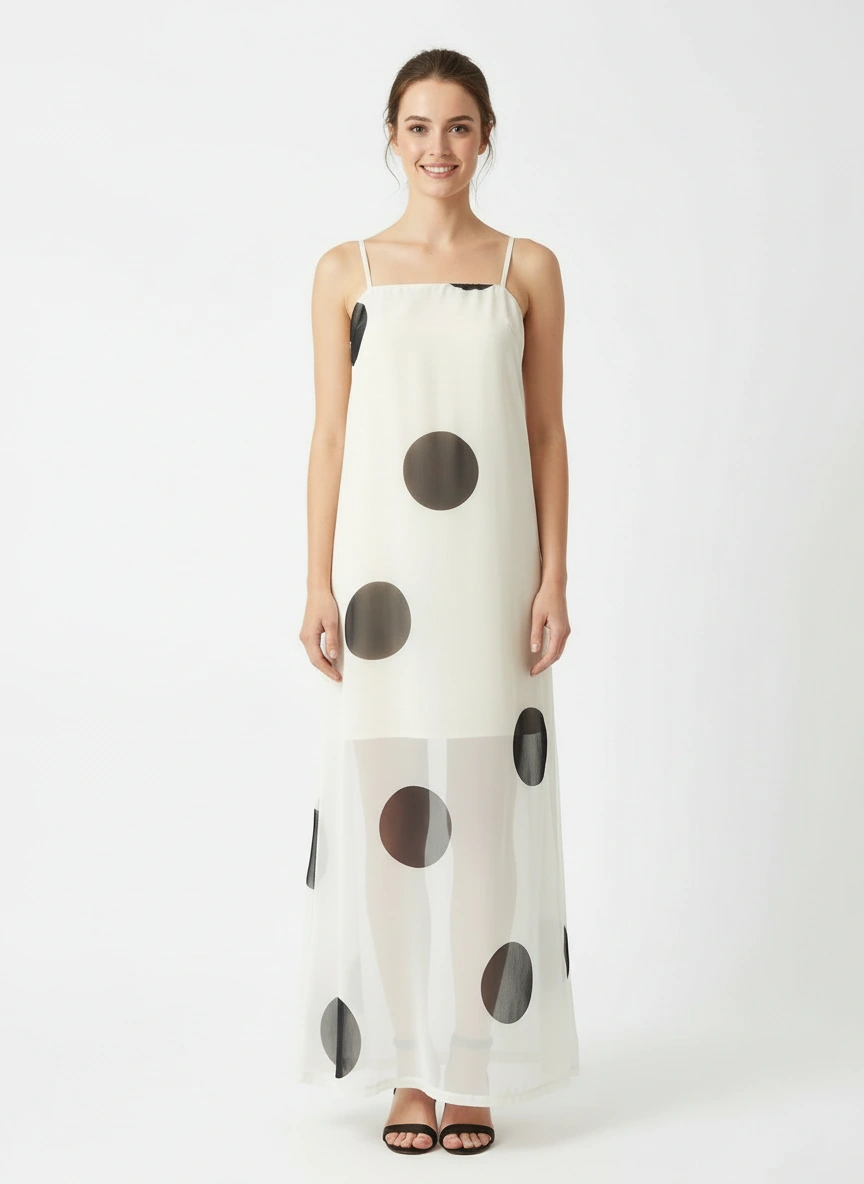 This elegant maxi dress captures the essence of coastal sophistication with its charming white polka...
