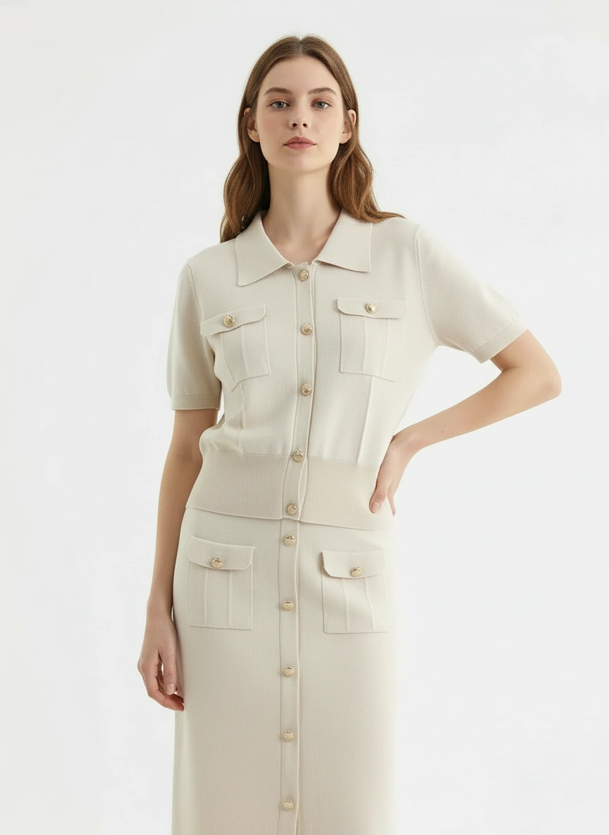 Discover effortless sophistication with this light beige short sleeve top and midi skirt pairing, a refined ensemble perfect for transitional seasons. The short sleeves provide comfortable coverage while maintaining a contemporary silhouette, while the graceful midi skirt creates an elongated, flattering line. Warm beige complements all skin tones and coordinates seamlessly with virtually any accessory, maximizing styling versatility across diverse occasions. Quality construction ensures both pieces maintain their shape and appearance through repeated wear and cleaning. Wear as a coordinated set for cohesive impact or separate each piece to create layered combinations with existing wardrobe basics and statement accessories. This ensemble proves that neutral dressing, when executed with thoughtful proportions and quality fabrication, delivers timeless elegance suitable for professional environments and casual social occasions alike.