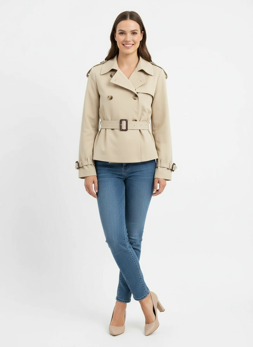 Elevate your layering game with this polished khaki jacket, featuring a classic double-breasted front that adds structure and visual interest. The cropped length offers contemporary versatility, pairing effortlessly with dresses, trousers, and casual separates for both professional and weekend styling. The neutral khaki tone complements a wide range of color palettes while maintaining a refined, put-together aesthetic. Expertly tailored for those seeking a foundational piece that bridges casual and formal wear, this jacket delivers timeless appeal and practical elegance for any wardrobe.
