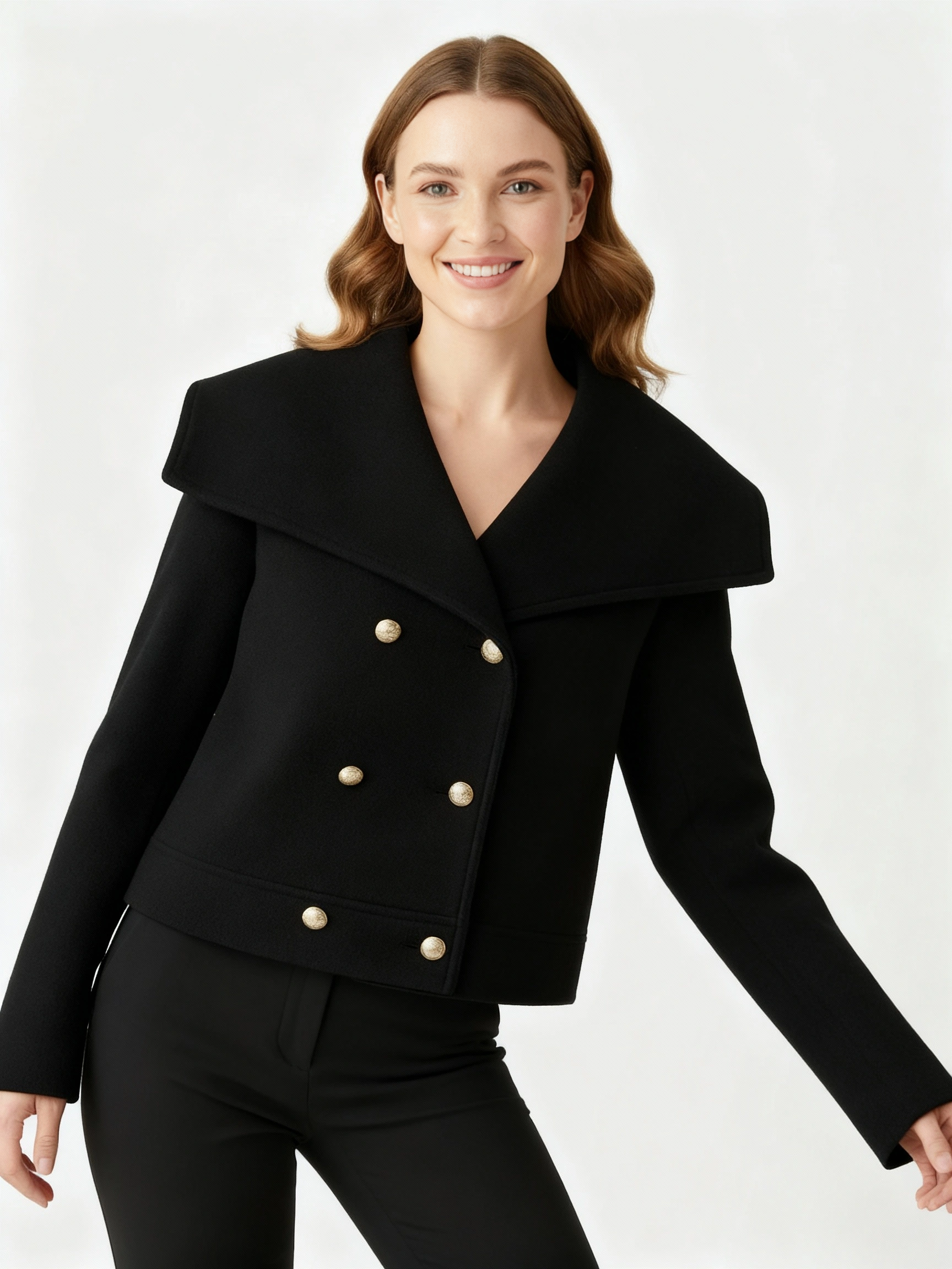Command attention with this black double-breasted suit jacket, expertly tailored in a shorter cut for contemporary proportions. The double-breasted front creates a bold, structured silhouette that exudes authority and refinement. The abbreviated length offers modern versatility, pairing effortlessly with tailored trousers, skirts, or contemporary separates. Constructed with precision tailoring, this jacket delivers a sharp, polished appearance suitable for boardrooms, formal events, and elevated occasions. The timeless black hue ensures seamless integration into any professional wardrobe, making it an indispensable investment piece.